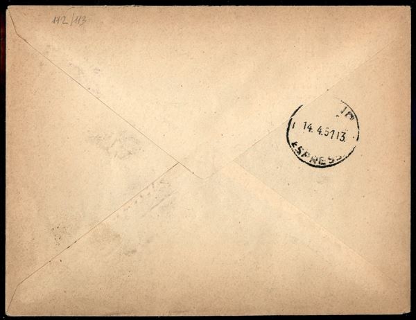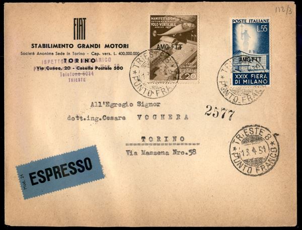 Busta espresso affrancata con XXIX Fiera di Milano soprastampati (112/113) - serie completa - da Trieste a Milano del 13.4.51 (2° giorno d'emissione)