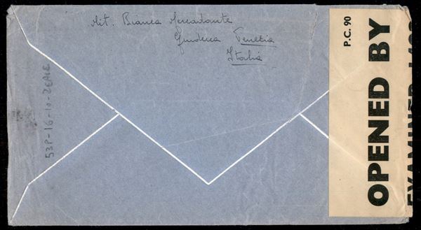 Busta per via aerea affrancata con coppia orizzontale del 2 lire Imperiale Aerea (15) da Venezia a New York con censura del 23.5.41 (in tempo di guerra)