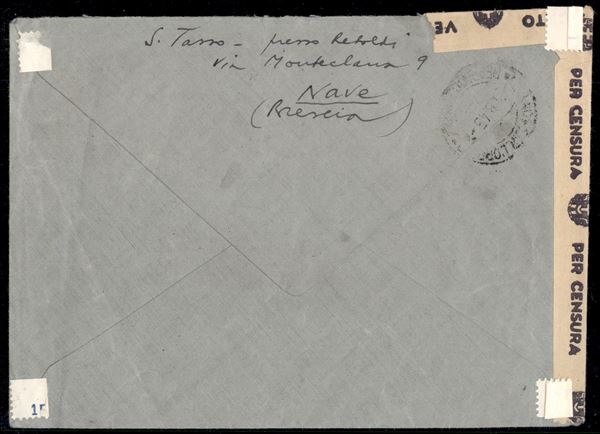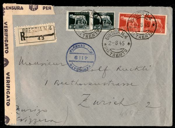 Busta raccomandata affrancata mista con Regno/Luogotenenza con coppia del 2,55 lire Imperiale (256) + coppia del 5 lire Imperiale (534) da Brescia per Zurigo del 2.8.45