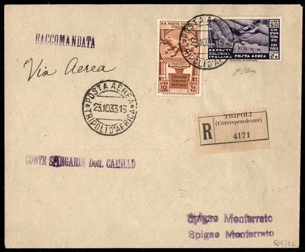 Busta raccomandata viaggiata 23.10.33 affrancata con 10 pił 50 lire Cinquantenario Eritreo (31 + Aerea 21) - rara - Oliva