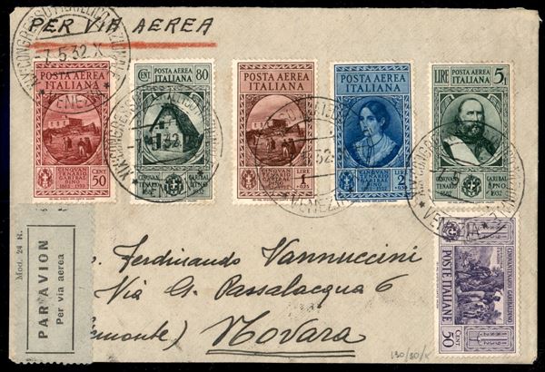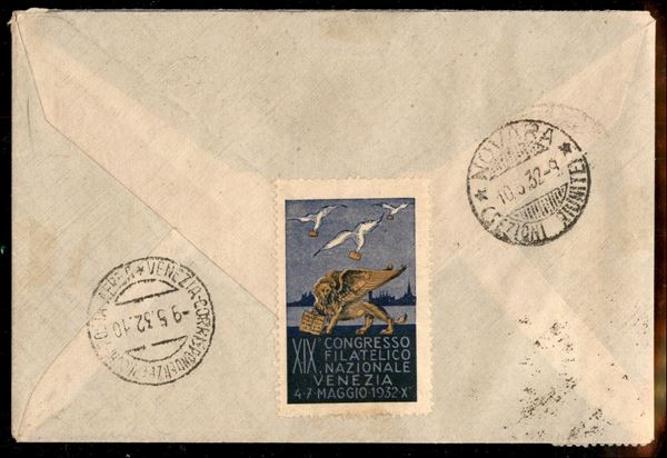 Busta viaggiata affrancata con la serie Aerea Garibaldi pił complementare (Aerea 32/6 + 319) - 7.5.32 - annulli del Congresso Filatelico Venezia