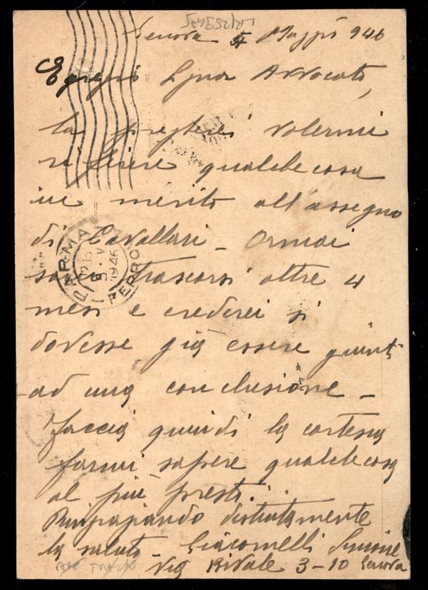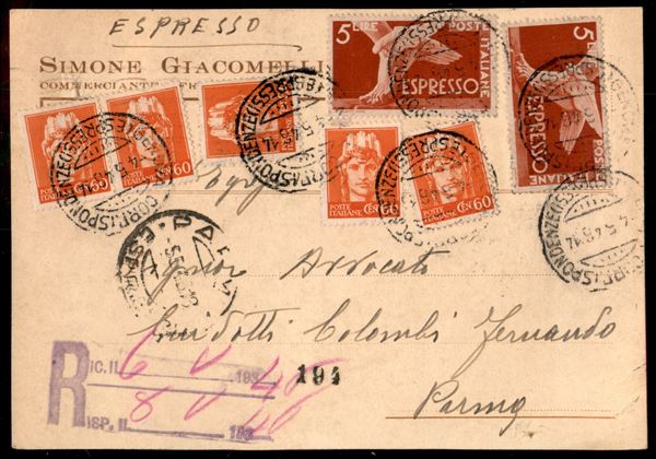 Cartolina espresso affrancata con cinque 60 cent (539 Luogotenenza) + due 5 lire Espresso (25) da Genova per Parma del 4.5.46