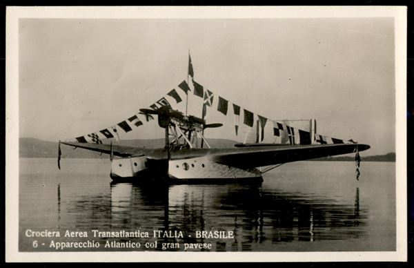 Cartolina fotografica Crociera Aerea Italia/Brasile "Apparecchio Atlantico col Gran Pavese" - Ed. A. Traldi - Milano - nuova