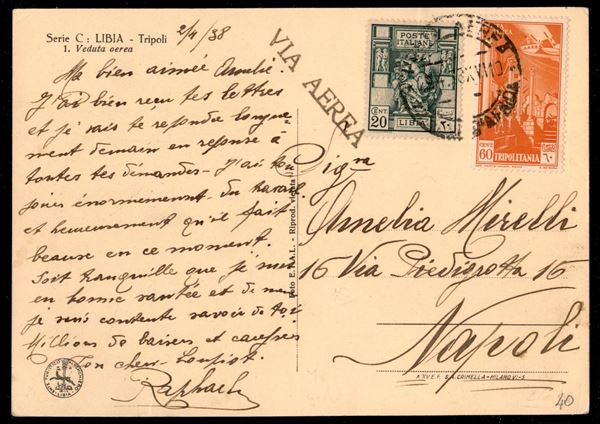 Cartolina via aerea affrancata con 60 cent Aerea Soggetti Africani (10) + complementare 20 cent Sibilla (40 Libia) da Tripoli per Napoli del 2.4.38