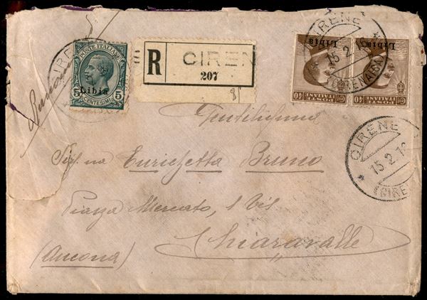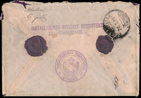 Cirene (Cirenaica) 15.2.16 - 5 cent (3) + due 40 cent (8) su raccomandata del Distaccamento Speciale Sussistenza (in viola al retro) per Chiaravalle