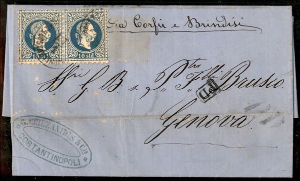 Coppia del 10 soldi (4) su lettera da Costantinopoli a Genova del 17.1.1874 - un valore mancante