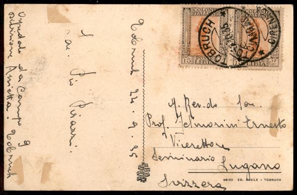 Coppia del 15 cent (25g) con centro spostato - cartolina da Tobruch a Lugano del 24.9.35