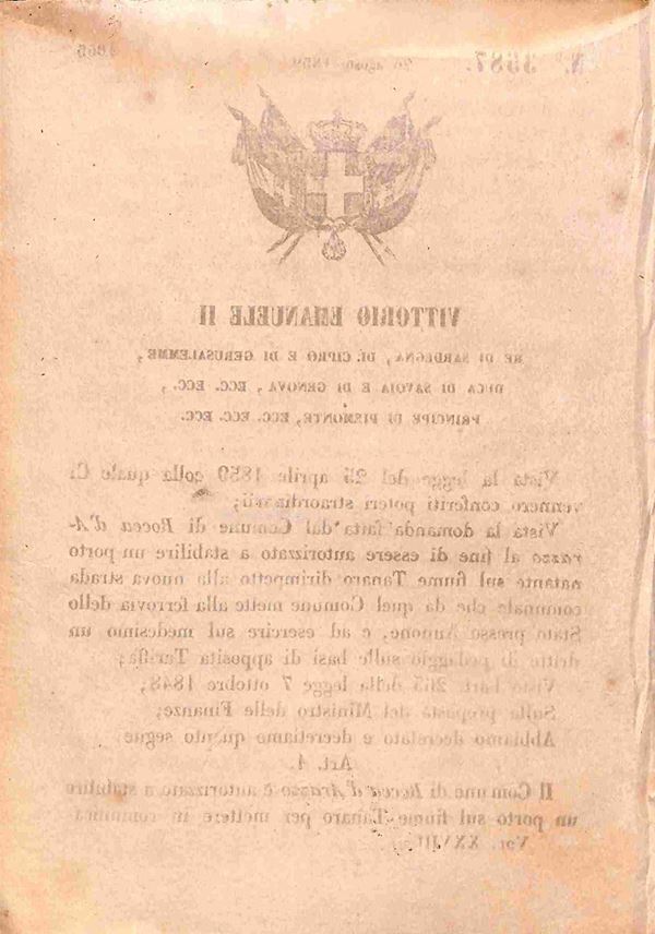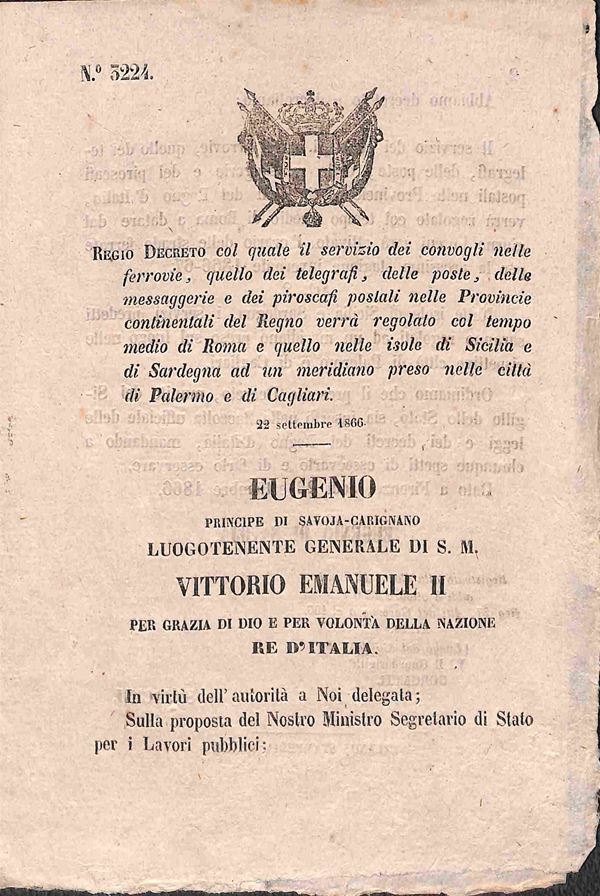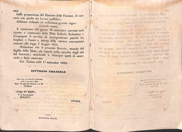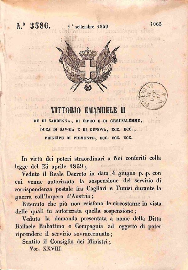 Due Decreti sui trasporti (1859 + 1866) + Gazzetta Piemontese del 1853 con itinerario del mese di maggio dei Piroscafi Sardi Napoletani e Francesi - interessante insieme di documenti