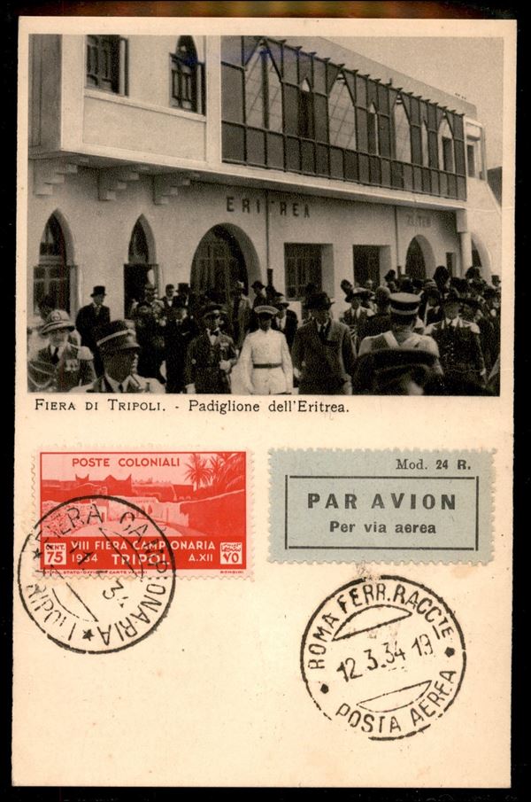 Fiera Campionaria (126 + 128 + 130) - 3 valori su cartolina raccomandata da Tripoli a Roma del 11.3.1934