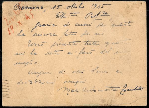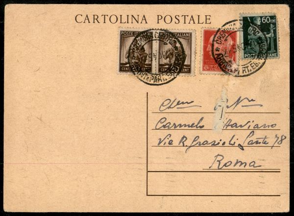 Intero postale da 30 cent Mazzini (C112) ricoperto con valori della Luogotenenza e Democratica (537 + coppia 544 + 548) da Cremona a Roma del 17.10.45