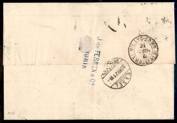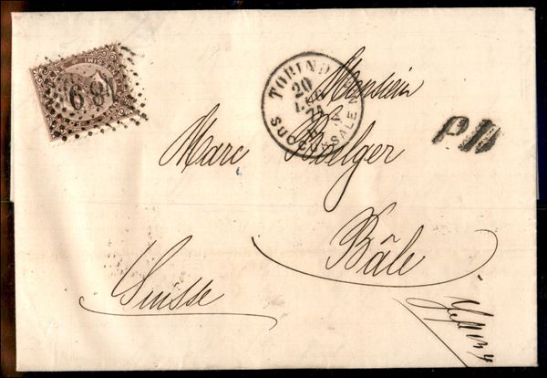 Lettera affrancata con 30 cent V. Emanuele II (T19) da Torino per Basilea del 20 lug. 1874 con Ambulante N. 2 Milano - Como