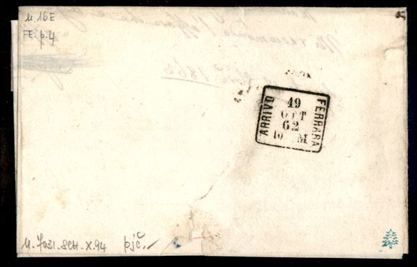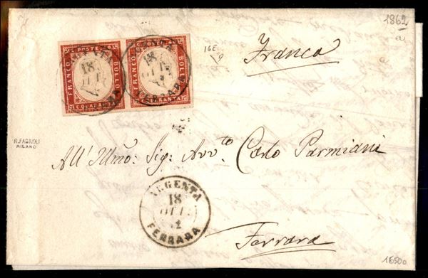 Lettera affrancata con coppia orizzontale del 40 cent (16E) con ampi margini da Argenta per Ferrara del 18. ott. 62 - Diena - ex coll. Provera