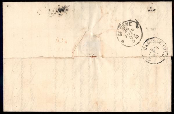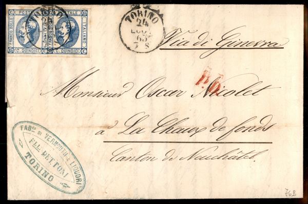 Lettera affrancata con due 15 cent Litografico (12 + 13) - due diverse emissioni - da Torino a La Chaux De Fond via Ginevra del 24 lug. 63