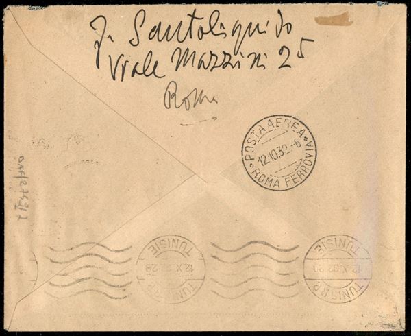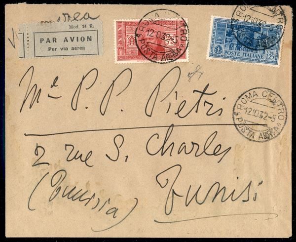 Lettera vai aerea per Tunisi da Roma 12.10.32 con Garibaldi 1,25 lire azzurro pił Pro Societą Dante Alighieri 75 cent carminio ( (309 + 321)