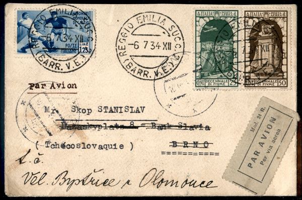 Lettera via aerea per la Cecoslovacchia con Mondiali di Calcio 1,25 lire azzurro + Decennale di Fiume Aerea 25 cent verde + 50 cent bruno (360 + Aerea 60/61) da Reggio Emilia 6.7.34 - rispedita