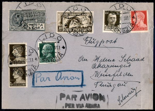 Lettera via aerea per la Svizzera da Lido di Venezia 19.6.36 con cinque francobolli della serie Imperiale + 30 cent Fiera di Milano + Aerea 60 cent grigio (Aerea 3) valori gemelli da centesimi trenta