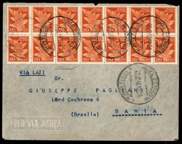 Miti e Simboli blocco di quattordici esemplari 80 cent arancio (Aerea 13) su aerogramma via Lati per il Brasile da Roma 22.8.40 a Bahia - mancante di un aletta al verso ma con bollo d'arrivo - Vaccari - ex coll. Provera