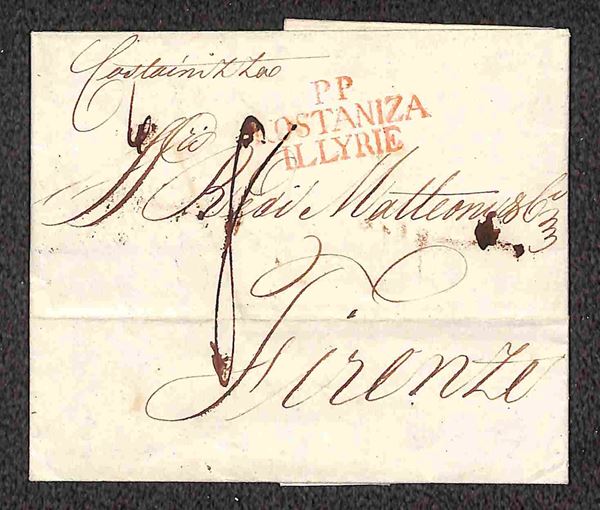PP Kostaniza Illyrie (rosso) - lettera per Firenze del 29.1.1812 tassata 6 + 8 + al retro 12 Fevrier