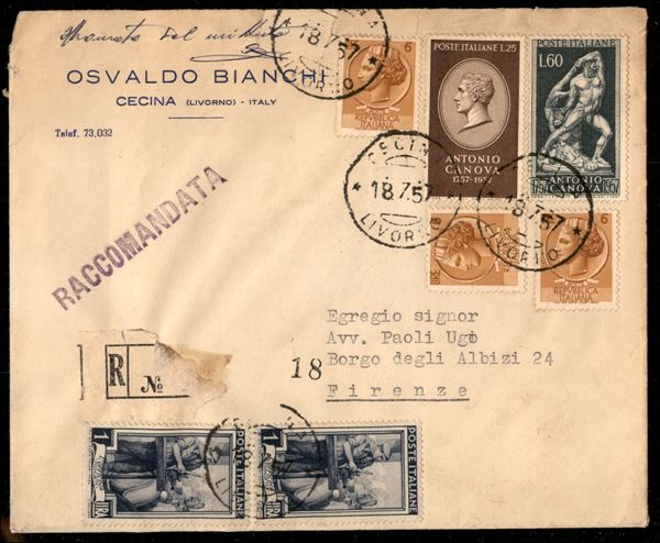 Raccomandata affrancata con due 1 lira Italia al Lavoro (755) + tre 6 lire Turrita (763) + Canova 60 lire + 25 lire (812 + 813) da Cecina per Firenze del 18.7.57