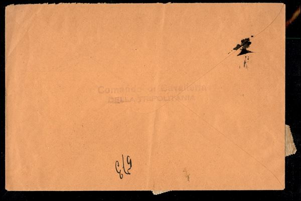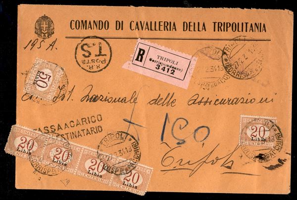 Raccomandata per cittą (Tripoli 27.2.34) con tassa a carico per 1,50 lire (3 striscia di cinque applicata a cavallo + 6) - Diena (2240)