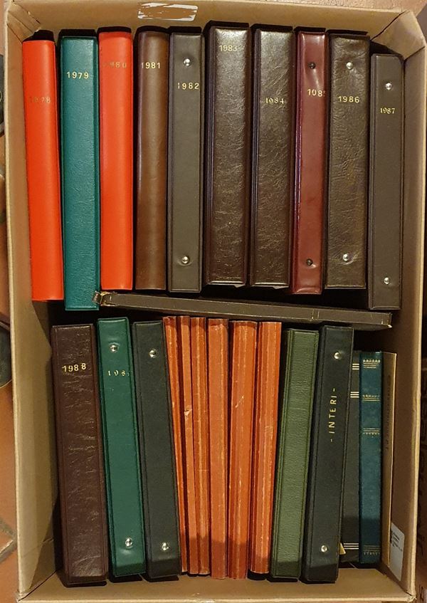 REPUBBLICA - 1978/1993 - Collezione quasi completa di valori nuovi montati sui bollettini postali delle emissioni in 15 raccoglitori + 6 cartelline + miscellanea eterogenea in 3 album e alcune buste il tutto in uno scatolone - valori singoli e in parte in quartine - alto valore di facciale (oltre 500000 lire) - merita esame
