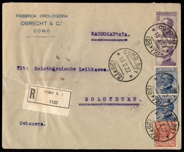 Tricolore - Busta raccomandata affrancata con 10 cent Leoni (82) + coppia verticale del 25 cent e del 50 cent Michetti (83 + 85) da Como a Solothurn del 18.2.22