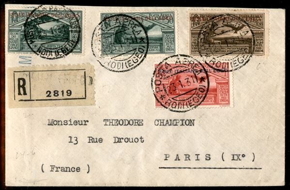 Virgilio (23 + 27 coppia/al retro + Aerea 4/6) - 4 valori su raccomandata da Rodi a Parigi del 23.1.31