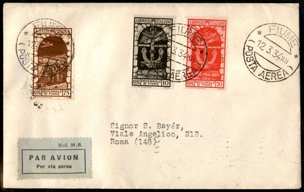 12 marzo 1934 - Fiume - 10 cent (350) + 20 cent (351) + 75 cent (62 - Aerea) - aerogramma FDC da Fiume a Roma nel giorno d'emissione