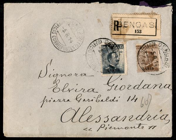 15 cent Michetti (5) con grande piega di carta verticale al centro (non aperta) + 40 cent Michetti (8) - raccomandata da Bengasi a Alessandria del 5.8.1914