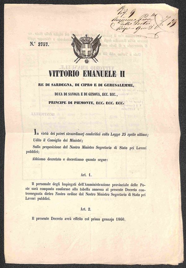 1859 (20 novembre) - Decreti 3757 + 3758 - Stipendi del personale delle Poste (dal 1° gennaio 1860)