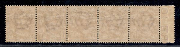 1906 - 10 cent Leoni (82/82q) - striscia orizzontale di cinque - pezzo centrale con cifra 1 formata da quattro puntini - gomma integra - ex coll. Provera