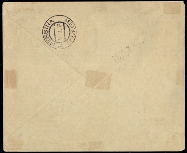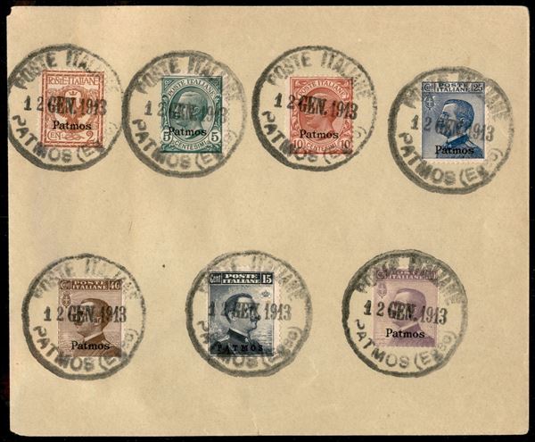 1912 - Soprastampati (1/7) - serie completa su busta annullati Poste Italiane 12. gen. 1913 Patmos (Egeo)
