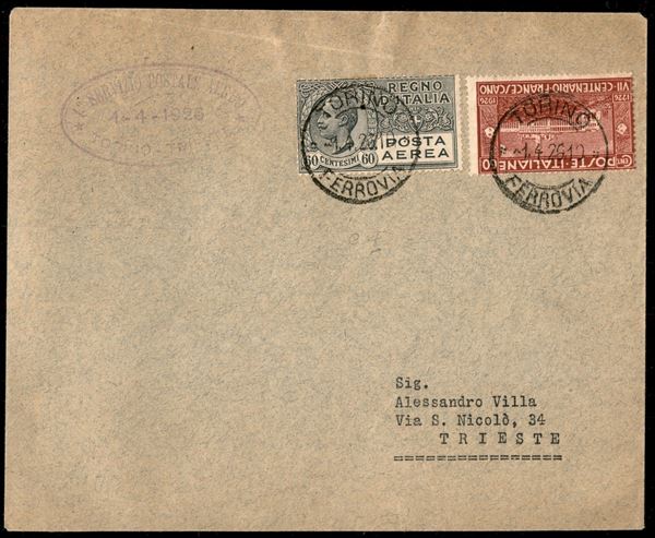1926 (1 aprile) - Torino Trieste - aerogramma del primo volo (1437) con al verso doppio annullo d'arrivo (meccanico + a mano) - molto raro