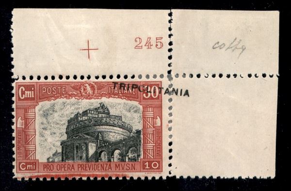 1929 - Tripolita(nia) su 30 + 10 cent Milizia (50a) - con parte della soprastampa (obliqua a cavallo del bordo foglio staccato e unito con linguella) - numero di Tavola in alto - pezzo unico - Diana + Cert. Colla