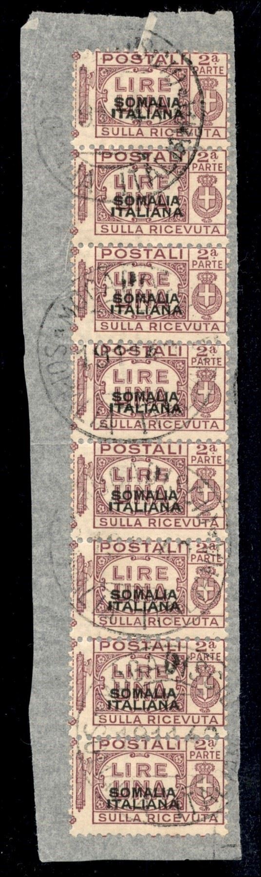 1931 - 1 lira (60 - figlia) - striscia di 8 usata su frammento a Mogadiscio il 19.11.40 - cert. Raybaudi (1.200)