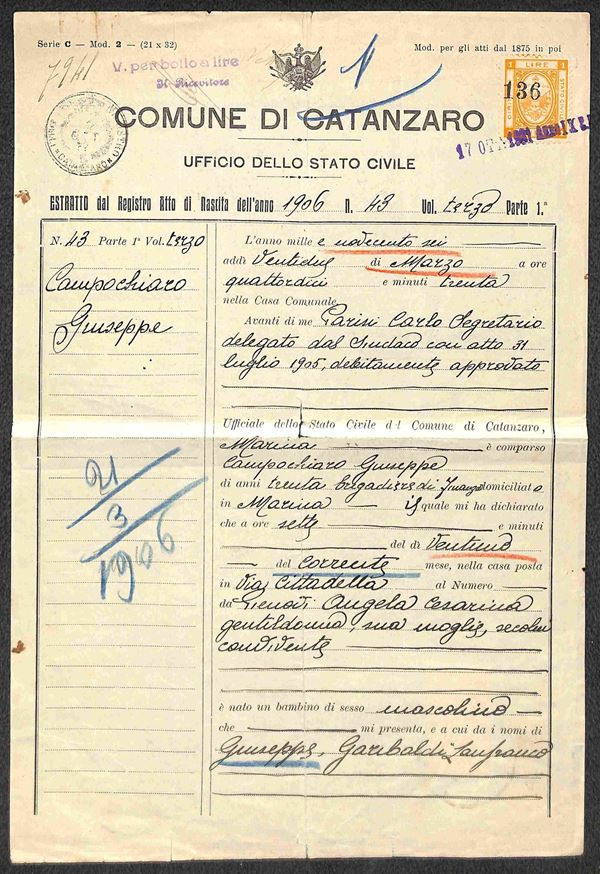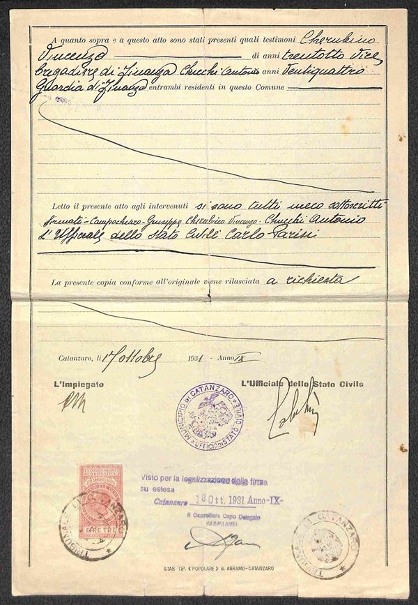1931/1932 - Catanzaro - Atto di Nascita + Certificato Generale - con Marche da Bollo