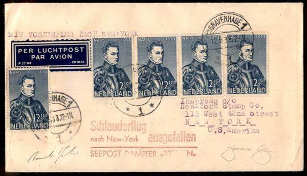 1933 (21 maggio) - Nave Bremen New York - aerogramma del volo catapultato non effettuato per problemi al motore - Longhi