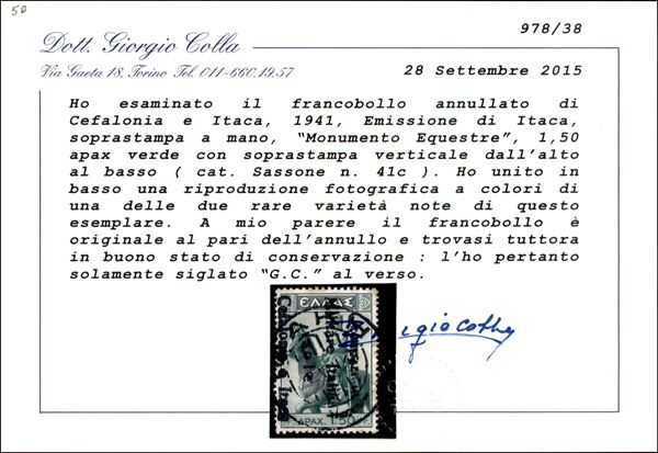 1941 - 1,50 din (41c) con soprastampa capovolta usato il 2.8.41 - lievi ingiallimenti - Diena + cert. Colla (7.000)