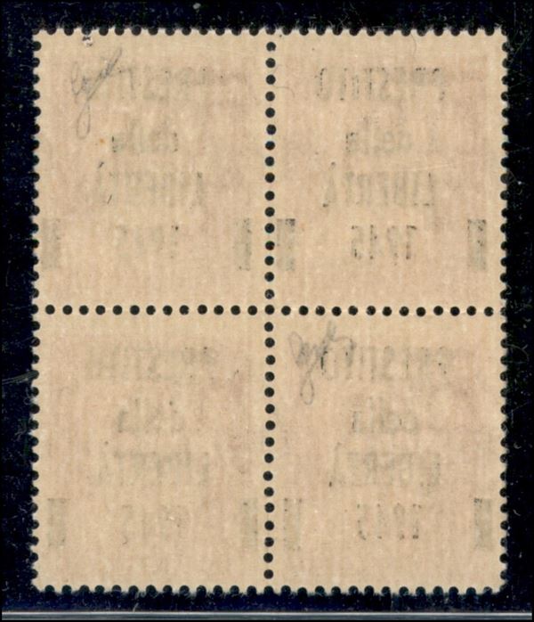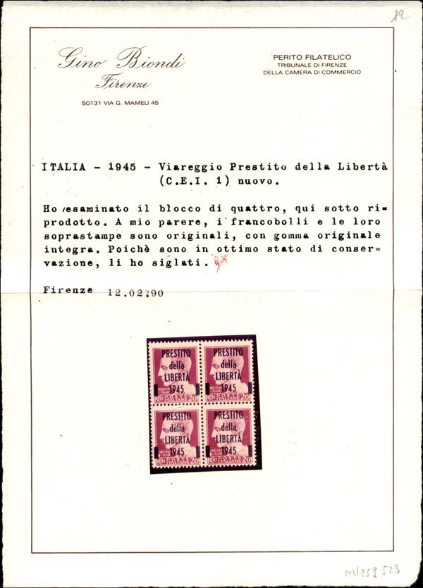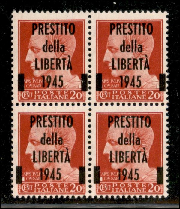 1945 - Viareggio - Quartina del 20 cent soprastampato Prestito della Libertà (CEI 1) - gomma integra