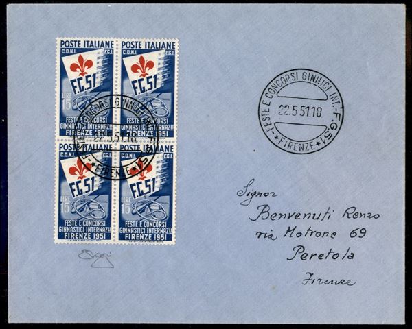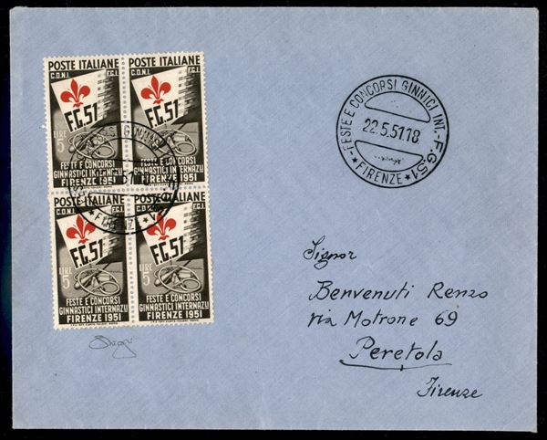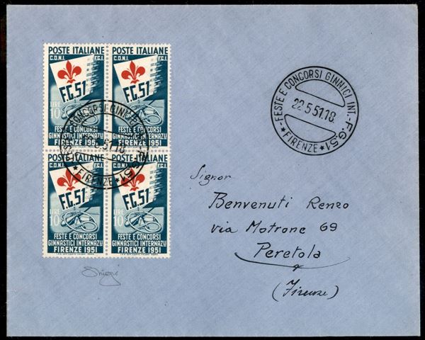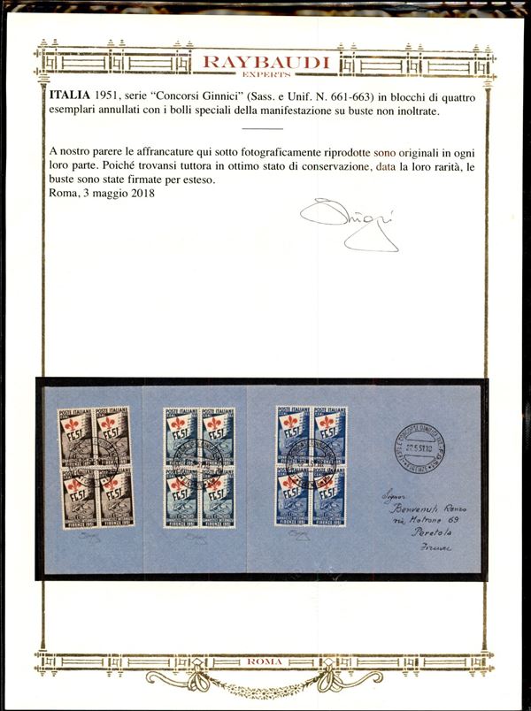 1951 - Ginnici (661/663) - serie completa in quartine su tre buste - Firenze 22.5.51 - cert. Raybaudi