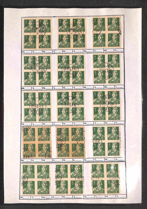 1956 - 2 fen (299) - 135 quartine usate su fogli d'album - notati una decina di blocchi del carta bruna (299b)