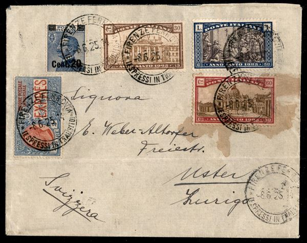 2 lire Espresso (13) + complementari Anno Santo e Michetti (170 + 172 + 173 + 176) su busta da Firenze a Uster del 8.6.25