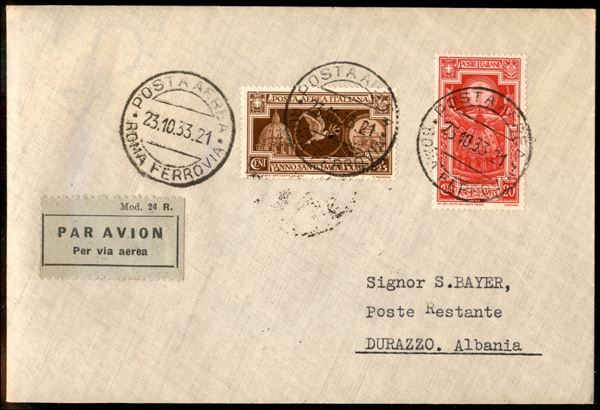 23 ottobre 1932 - Anno Santo - 20 cent (345) + 50 cent (54 - Aerea) - aerogramma FDC da Roma a Durazzo nel giorno d'emissione