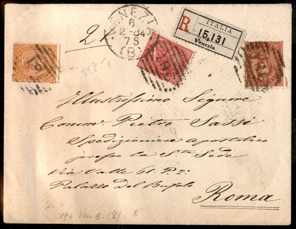 40 cent Vitt. Em. Ii + 10 cent + 20 cent Umberto I (20 + 38 + 39) su raccomandata due porti da Venezia per Roma del 6.2.84