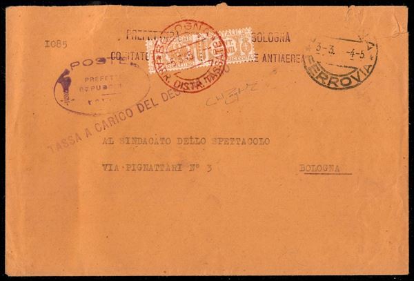 50 cent (28 - Pacchi Postali) usato come Segnatasse su busta per cittą - Bologna 3.3.45 - annullo rosso - cert. Raybaudi