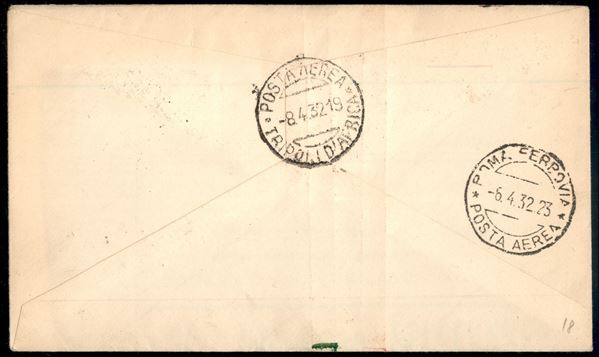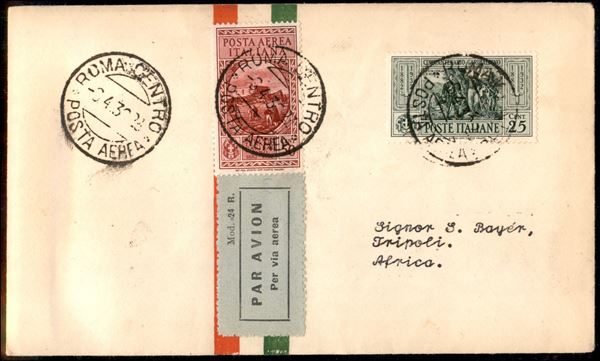 6 aprile 1932 - Garibaldi - 25 cent (317) + 50 cent (32 - Aerea) su aerogramma FDC da Roma a Tripoli nel giorno d'emissione