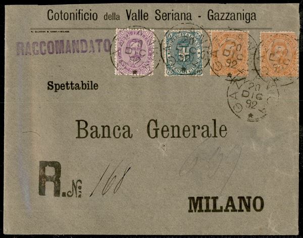 60 cent + due 20 cent (uno difettoso in angolo) + 5 cent (39 + 47 + 59) su raccomandata quattro porti da Gazzaniga per Milano del 20.12.92