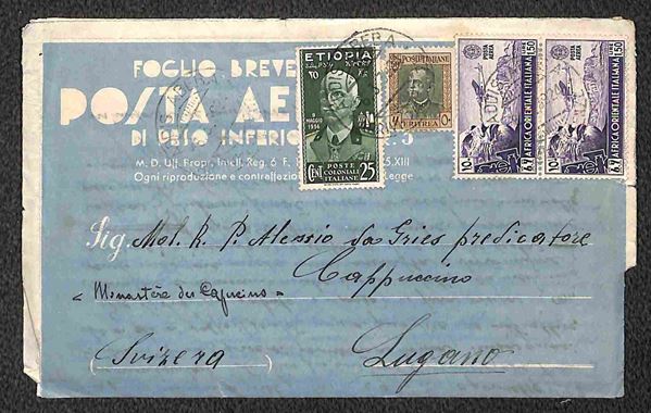 Aerogramma "Foglio brevettato per Posta Aerea AOI peso inferiore a gr. 5" affrancato con 25 cent (3) + coppia 1,50 lire AOI (6 Aerea) + 50 cent Eritrea (199) da Addis Abeba a Lugano del 6.3.39