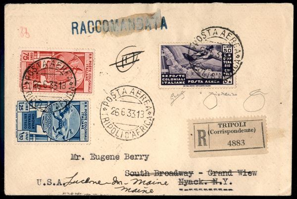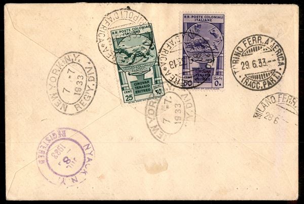 Aerogramma raccomandato affrancato con 50 lire Cinquantenario Eritreo (21) + complementari (25/28) da Tripoli a New York del 26.6.33 - Longhi