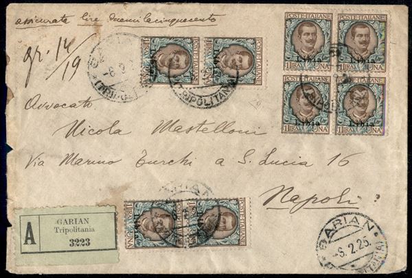 Assicurata affrancata con quartina + due coppie del 1 lira Floreale (10) + al retro Pittorica (25 + 28) da Garian a Napoli del 6.2.25